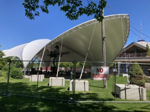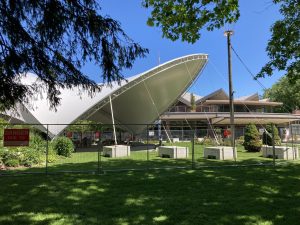 August 14, 2021, theatrical tent installed in parking lot at east end of Tom Patterson Theatre site. Jaan Pill photo